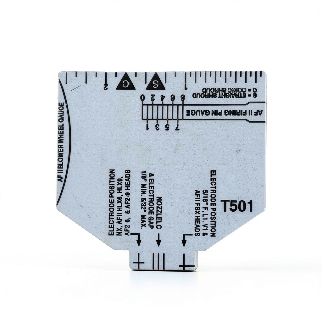The Dkaikai T501 Multipurpose Gauge is a precision setup tool designed for oil burner maintenance, offering accurate alignment and spacing adjustments. It features a 3 1/4-inch insulator length, 9/16-inch diameter, and 5 1/8-inch overall tip-to-threaded end length, crafted from durable materials to withstand industrial use. This gauge replaces T231 models and is compatible with Beckett AF/AFG/AR/SF/SR burners, ensuring reliable performance in setting tip gaps, center lines, nozzle faces, and blower wheel clearances.