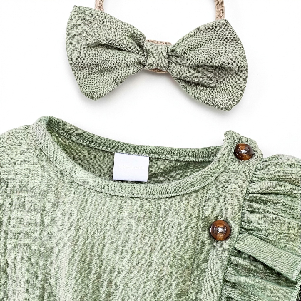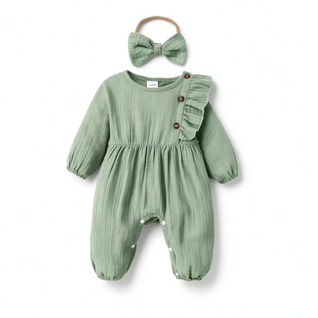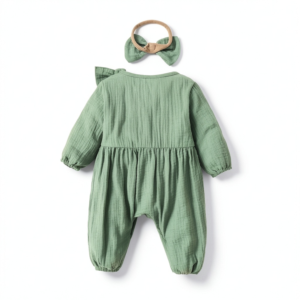 Introducing the Pavo baby girl romper, a premium outfit designed for comfort and style. Made from high-quality, soft, and breathable cotton, this romper ensures your baby stays cozy all day long. It features a charming smocked design, a round neckline, and practical snap closures for easy diaper changes and dressing. Available in sizes from Preemie to 3-6 months, this green romper includes a matching bow headband, making it a complete ensemble for your toddler. With a focus on durability and gentle materials, it’s perfect for sensitive skin and active play.