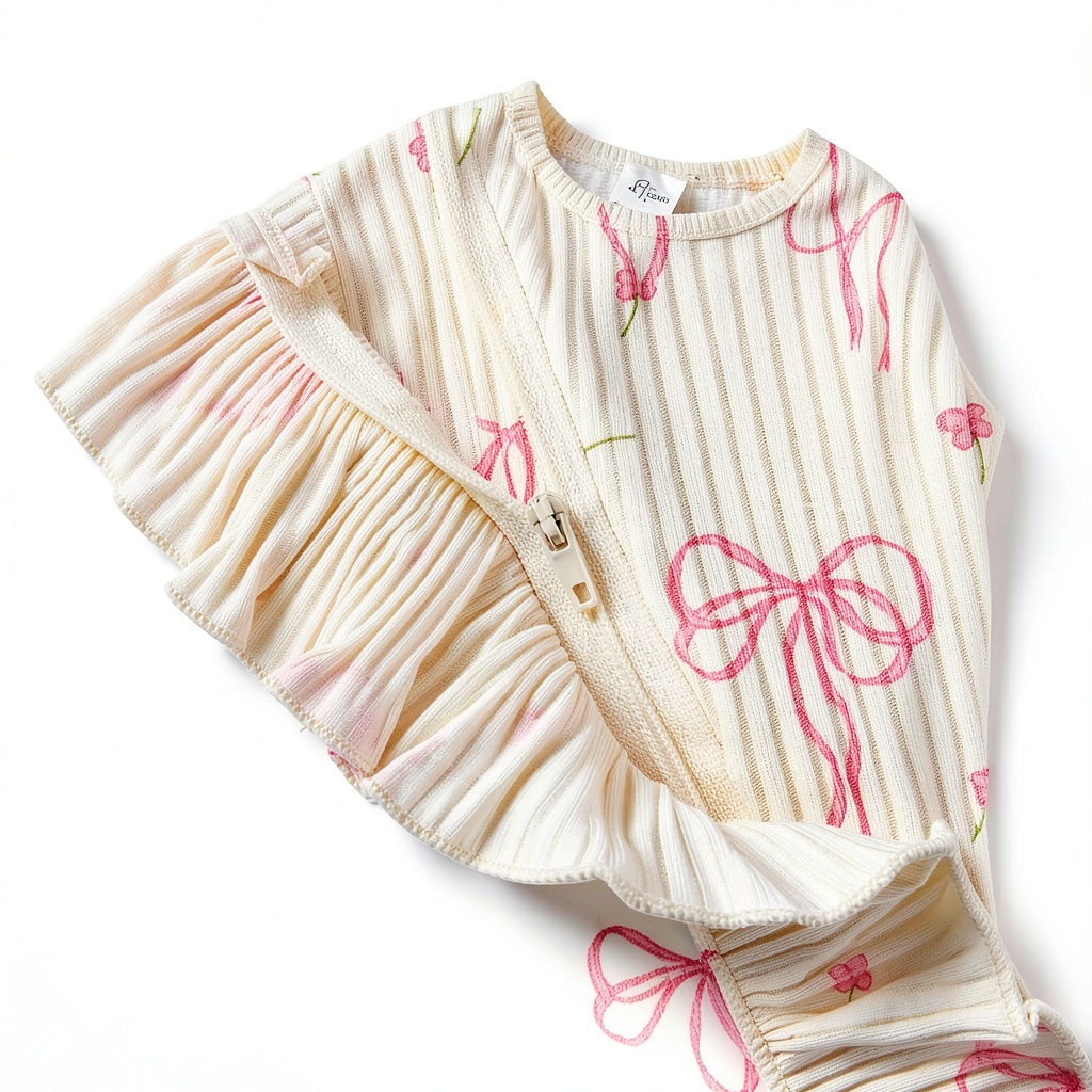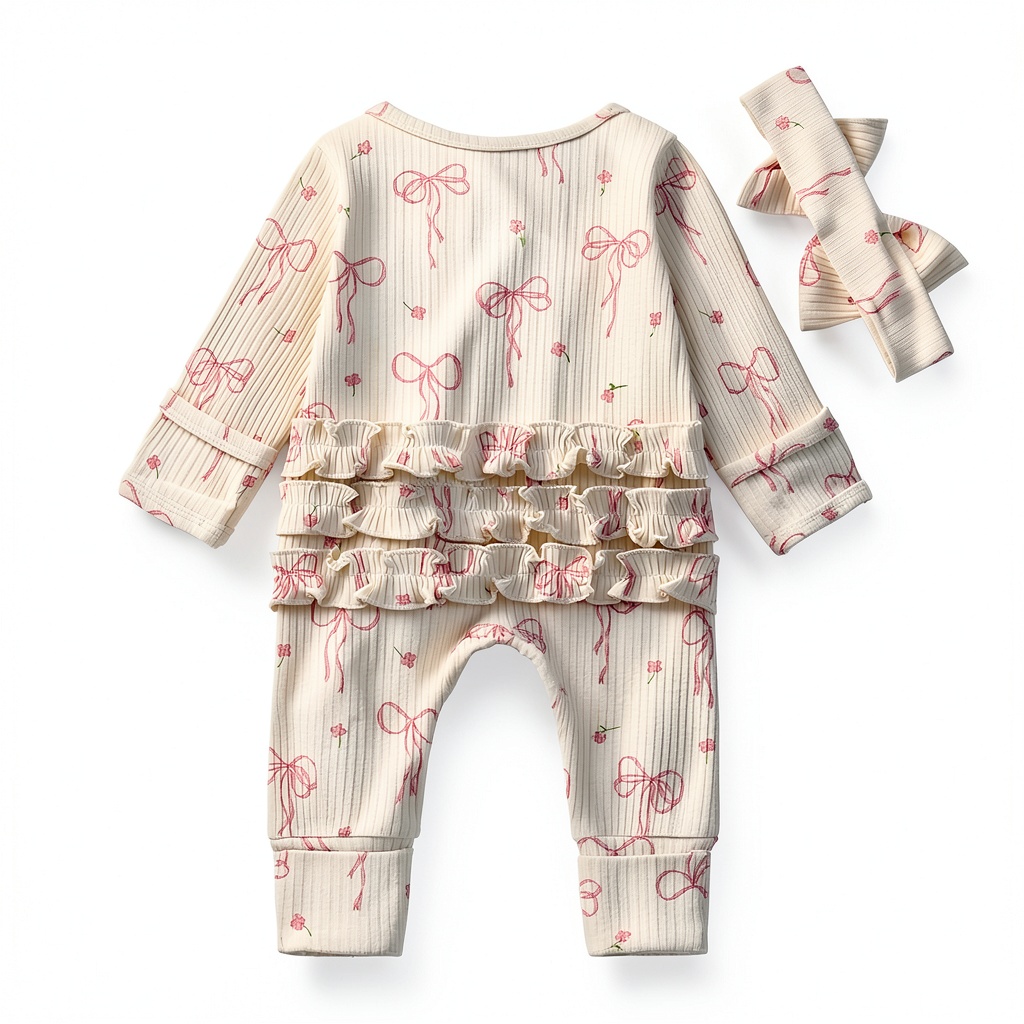 This premium baby girl romper combines exceptional comfort with charming design elements. Crafted from 95% high-quality cotton ribbed knit fabric, this outfit offers superior softness against delicate newborn skin. The long sleeve construction features practical mitten cuffs to keep little hands warm, while the adorable ruffle bottom adds a touch of feminine elegance. Available in multiple color options including Sweet Bow Pink, Cream, White, and Purple, each romper comes with a coordinating headband to complete the ensemble. Sizing ranges from newborn to 12 months, ensuring the perfect fit for your growing baby.