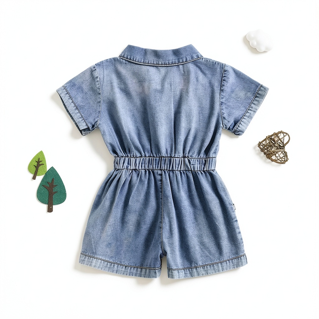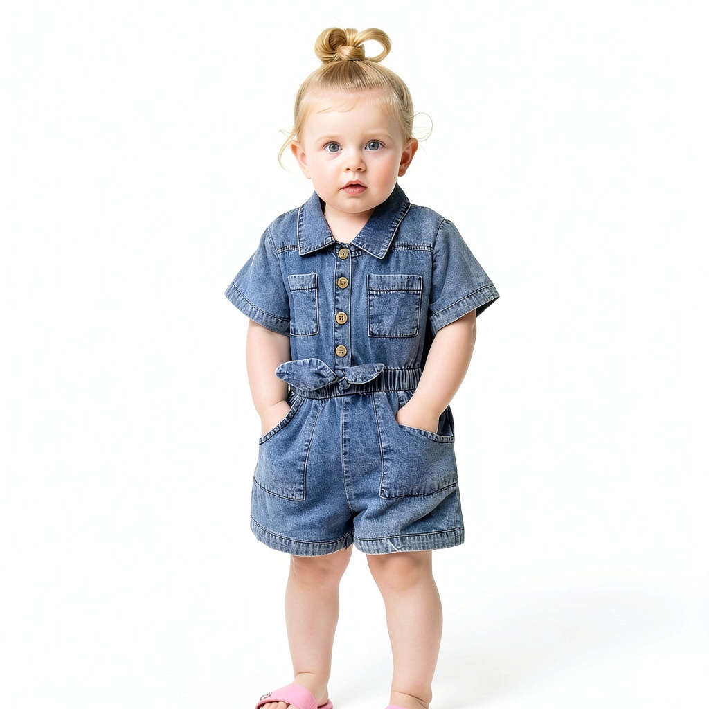 This toddler girl denim jumpsuit is designed for comfort and style, featuring a premium cotton blend fabric that is soft, breathable, and durable. The short-sleeve romper includes a front button-down design, elastic waist for a secure fit, and practical pockets. It is available in sizes ranging from 0-3 months to 5-6 years, with color options including Blue, Black, Army Green, Apricot, and Jumpsuit Pant styles. Crafted to withstand multiple washes, it maintains its shape and color, making it a reliable choice for active toddlers.